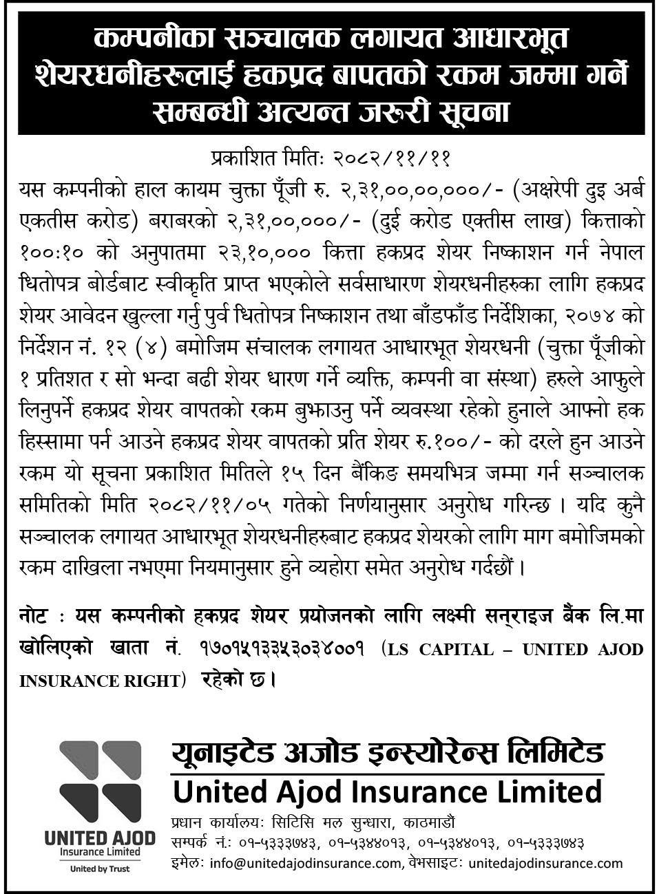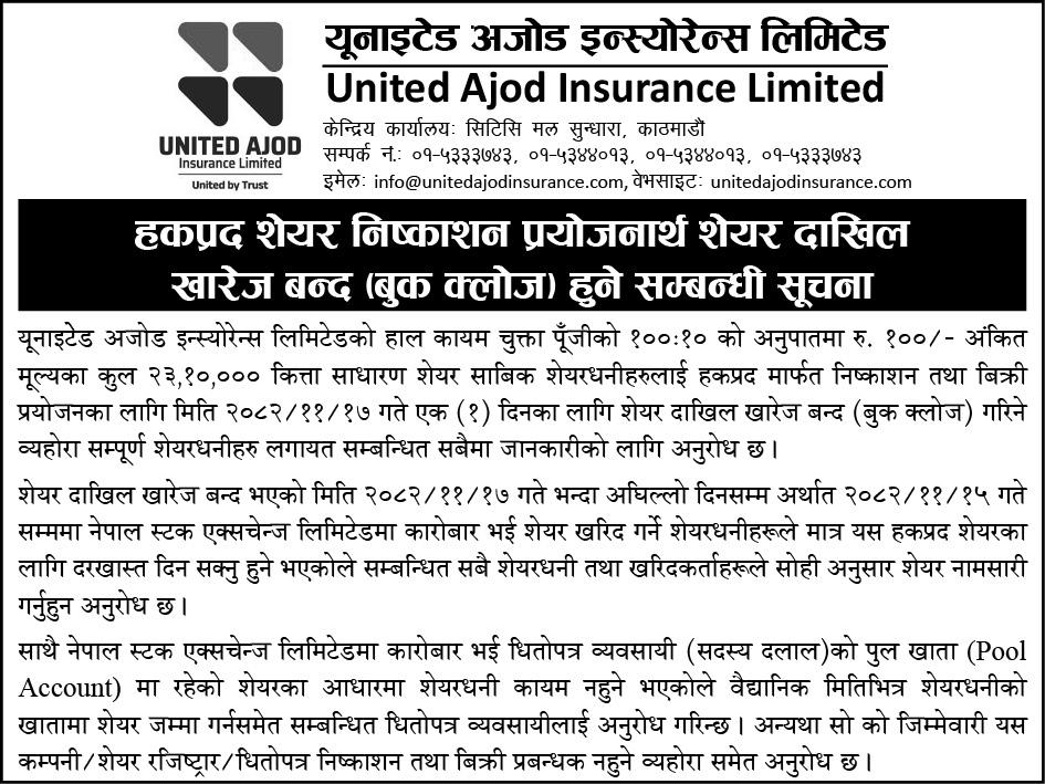 United Ajod Insurance Limited is an ISO 9001:2000 certified insurance company.The company has started its operation from May 28, 2023 (Jestha 14, 2080) after its registration with the Company Registrator's Office and approved by Insurance Board.