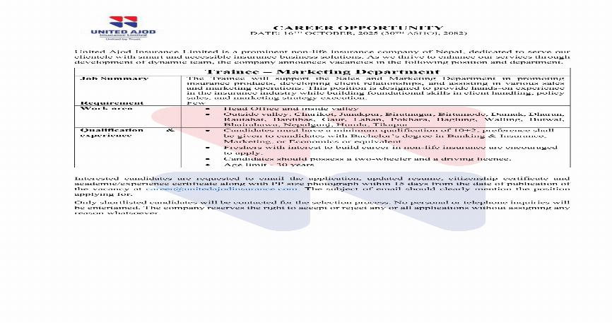 CAREER OPPORTUNITY ( TRAINEE - MARKETING DEPARTMENT )